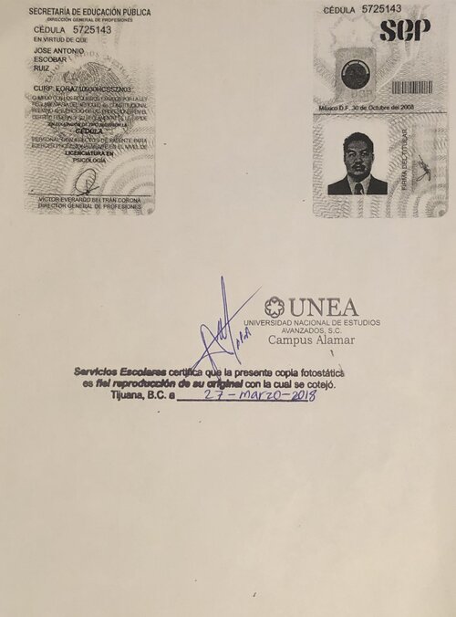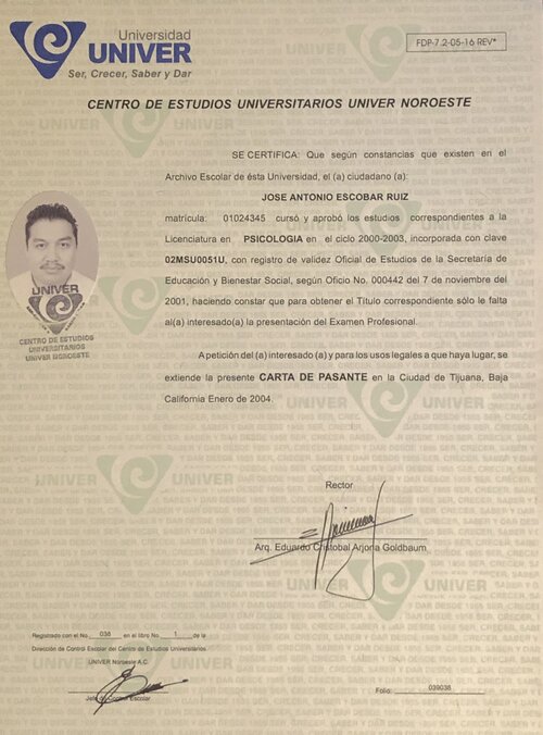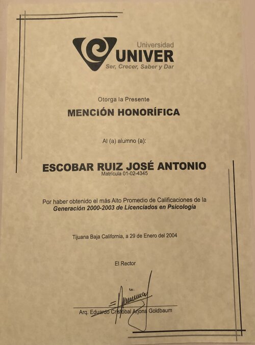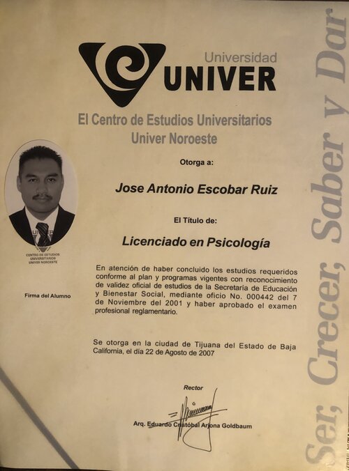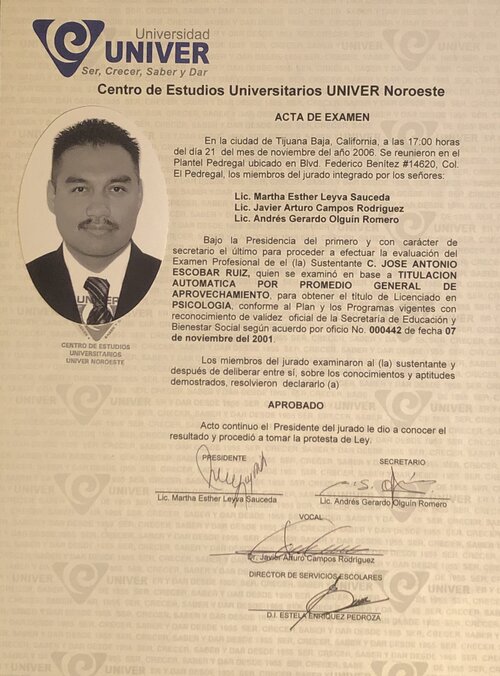 Egresado de la universidad Univer Noroeste en el año 2000-2003 en la ciudad de Tijuana B. C. Obteniendo la calificación más alta de su generación, y recibir mención honorifica por su desempeño en dicha disciplina, le fue otorgado el Título de Licenciado en Psicología de forma automática, ya que para él, no encuentra mayor satisfacción en la vida que poder ayudar a esa persona que emocionalmente se encuentra inestable. También estudio la Maestría de Administración de Negocios obteniendo una calificación de 9.8 en diciembre del 2019, es por eso que en la actualidad se encuentra enfocado en ayudar a las personas con deseos de superarse en cualquier ámbito de su vida ya sea mental, laboral, emocional, amoroso, etc.